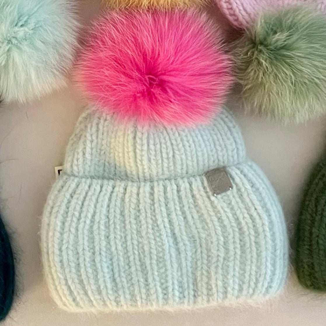 Vask og pleje: Tåler vask i hånden ved max 20 grader og med en lille smule uldvaskemiddel. Pompon'en skal tages af først - den er monteret med en sløjfe med dobbeltklude inde i huen. Lirk forsigtig båndende op for at undgå trevler. Undgå at vride huen, og lad den tørre fladtliggende på et håndklæde.