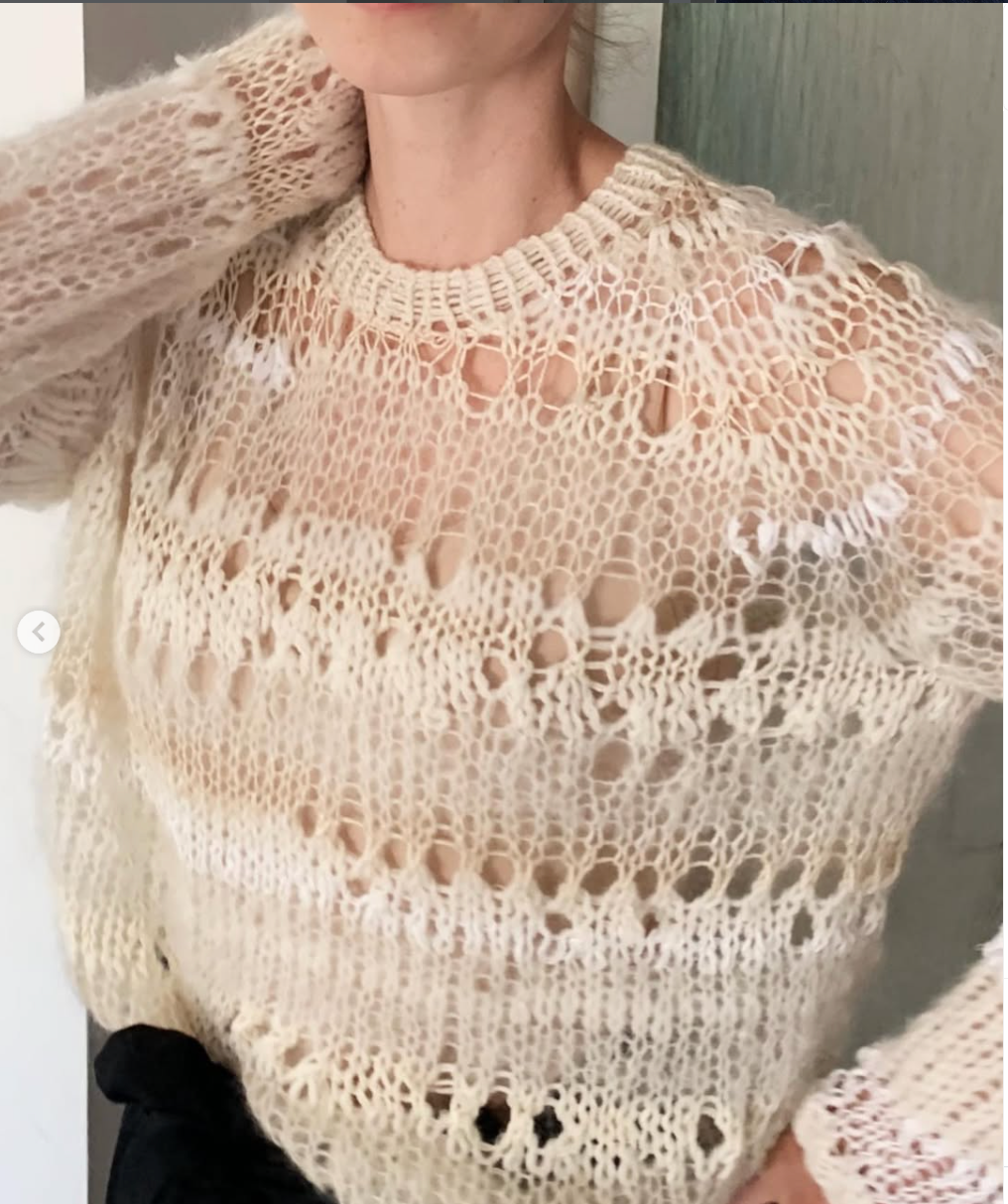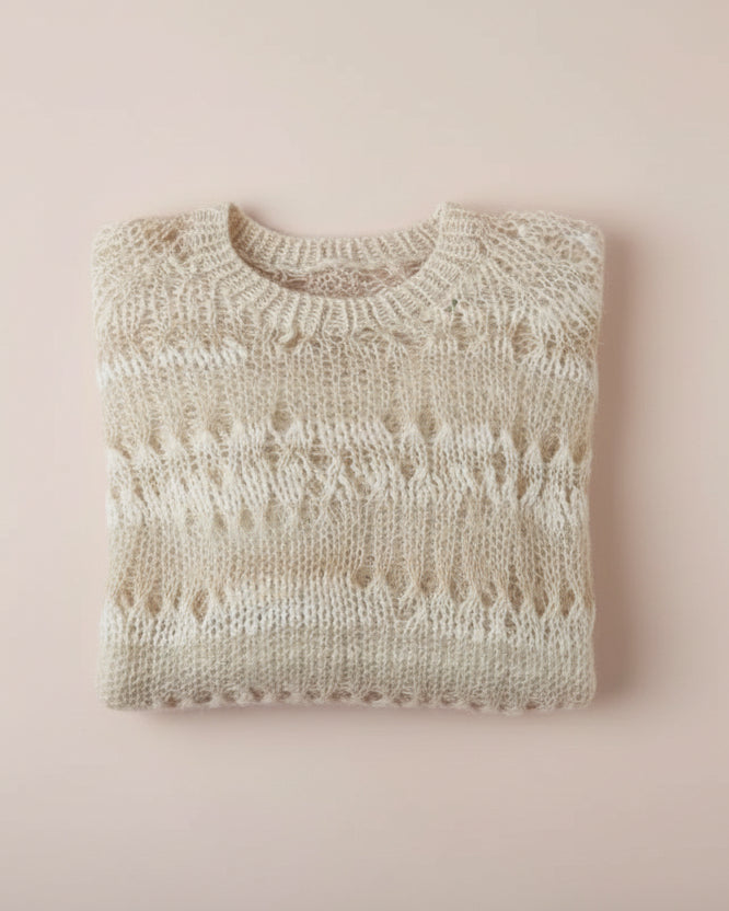 Lærke Baggers INNER CHILD håndstrikket i blødeste cremefarvede uld/silkemohair som base og udvalgte tone-i-tone restegarner af professionel teststrikker Sophie Skjoldager. Unikastrik til den kræsne connaisseur. Onesize (fitter S/M).