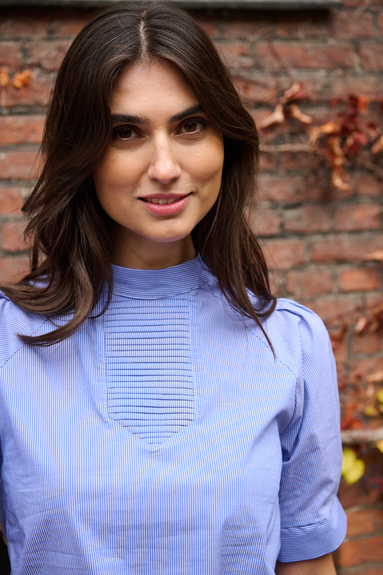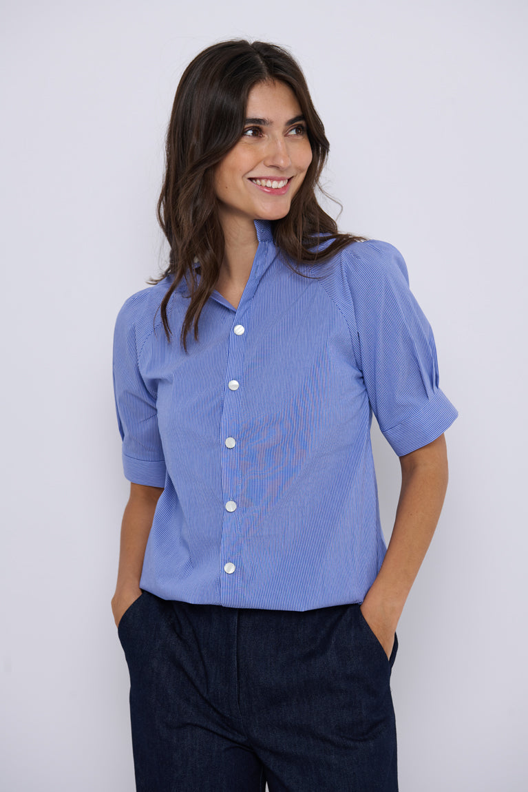 Tie er en fin, feminin skjortebluse med korte pufærmer, lille kinakrave og fine draperinger på fronten og knapper bagpå. Eller omvendt. Hvad der er for og bag, afhænger af din smag på dagen. Denne version af Tie er syet i 100% bomuld. Cool til jeans, nederdel, slacks, arbejde og fest.